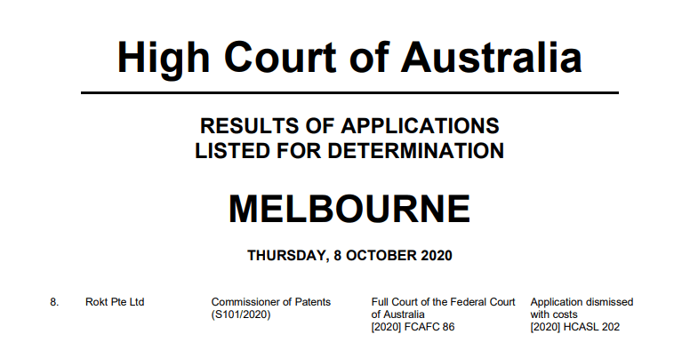 The High Court of Australia has dismissed an application for special leave to appeal from the Commissioner of Patents v Rokt Pte Ltd 1 of the Full Court of the Federal Court of Australia. As we have previously indicated, the law relating to the patentability of computer-implemented inventions is beginning to look settled in Australia by the decisions in Encompass Corporation, RPL Central and Research Affiliates.