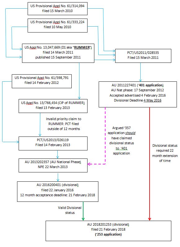 It was argued that the ‘253 application’s grandparent, AU 2013202357, could have and should have been amended to claim divisional status to the ‘401 application (indicated by the dashed pink arrow), when Rummer was first cited as prior art in mid-2013. The relevant error or omission was attributed to the previous US Attorney for not instructing such an amendment. This error or omission led to the parent and grandparent of the ‘253 application not timely claiming divisional status from the ‘401 application.