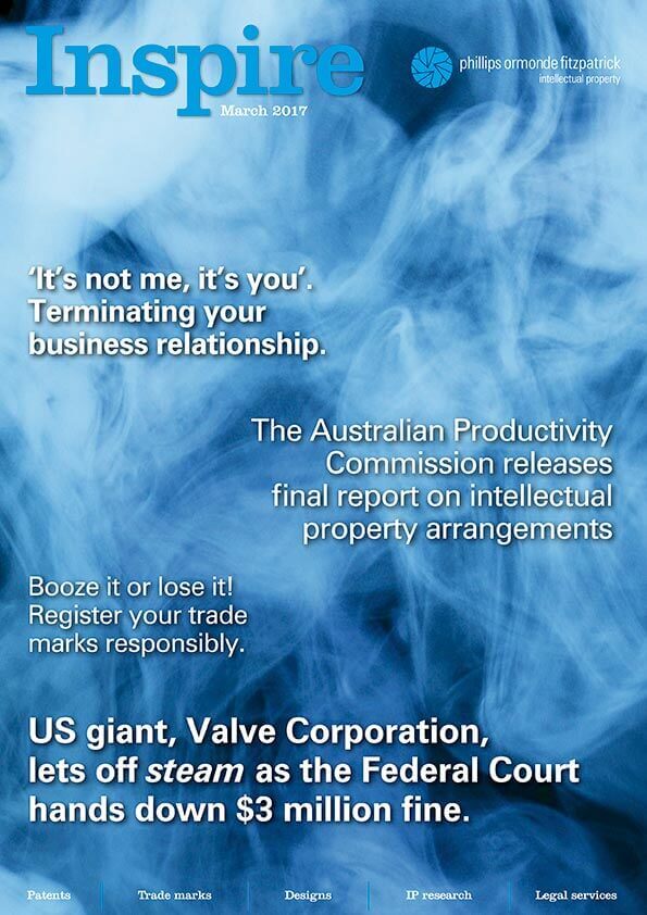 Inspire – March 2017 In this edition… In this edition… US giant, Valve Corporation, lets off steam as the Federal Court hands down $3 million fine The Australian Productivity Commission releases final report on intellectual property arrangements Booze it or lose it! Register your trade marks responsibly.