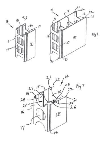 In this case, the patent related to hollow panels that snap-lock together to provide formwork for concrete on construction sites. The hollow panels are snap-locked together in the desired configuration and wet concrete poured into the hollow interior. The invention claimed in the patent was directed to the features of the snap-locking connection between the panels. These snap-lock features are illustrated in Figures 1 and 7 of the patent shown below.