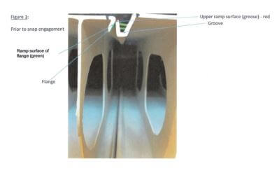 One side of each panel 15 has a pair of spaced flanges 21, each with an inwardly directed lip 22. The opposing side of each panel 15 has a corresponding pair of ramp surfaces 23 leading to a pair of grooves 19. To connect the panels, the ramp surfaces 23 of one panel are forced between the flanges 21 of the other panel. The ramps flex the flanges 21 outwards until the lips 22 resiliently ‘snap’ into the grooves 19. The patent defined this aspect of the panels as: